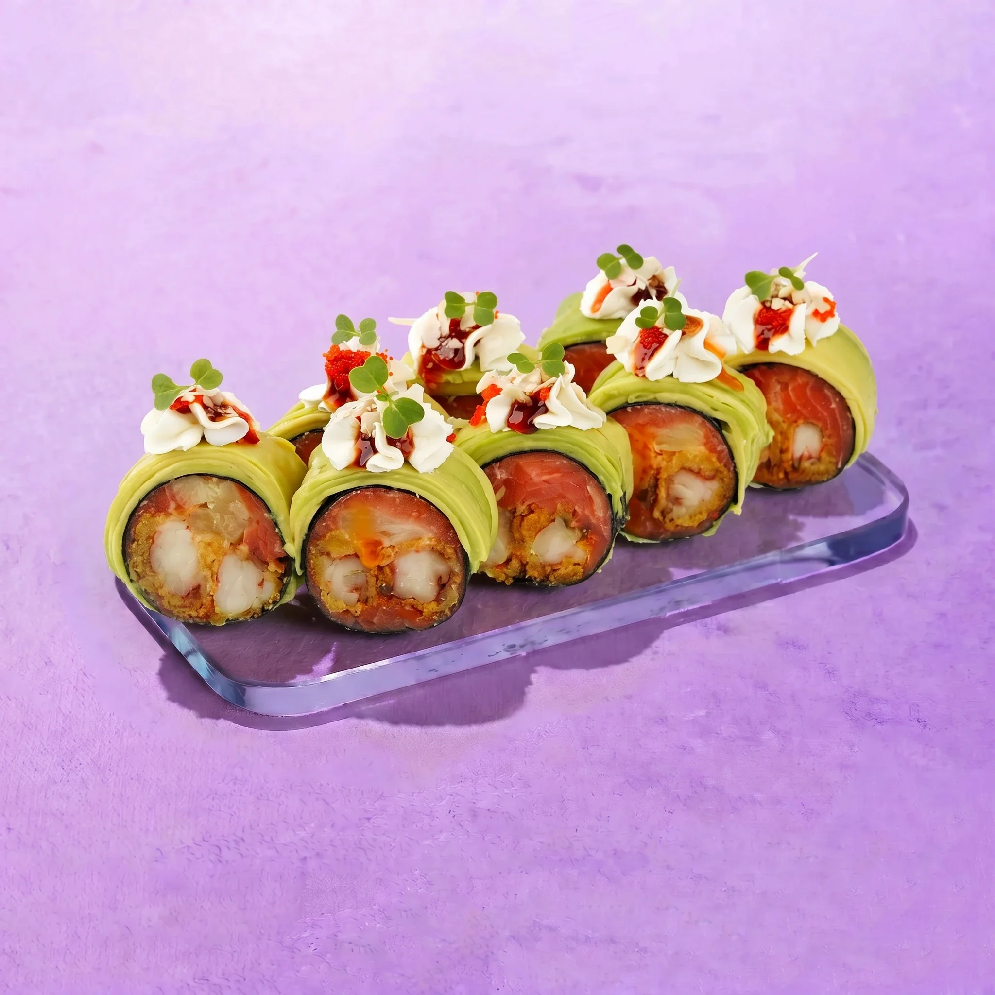 Лосось, креветка в темпуре, авокадо, ананас консервированный, творожный сыр, соус чили манго,соус унаги, икра масаго, миндаль хлопья, микрозелень броколи, водоросли нори.