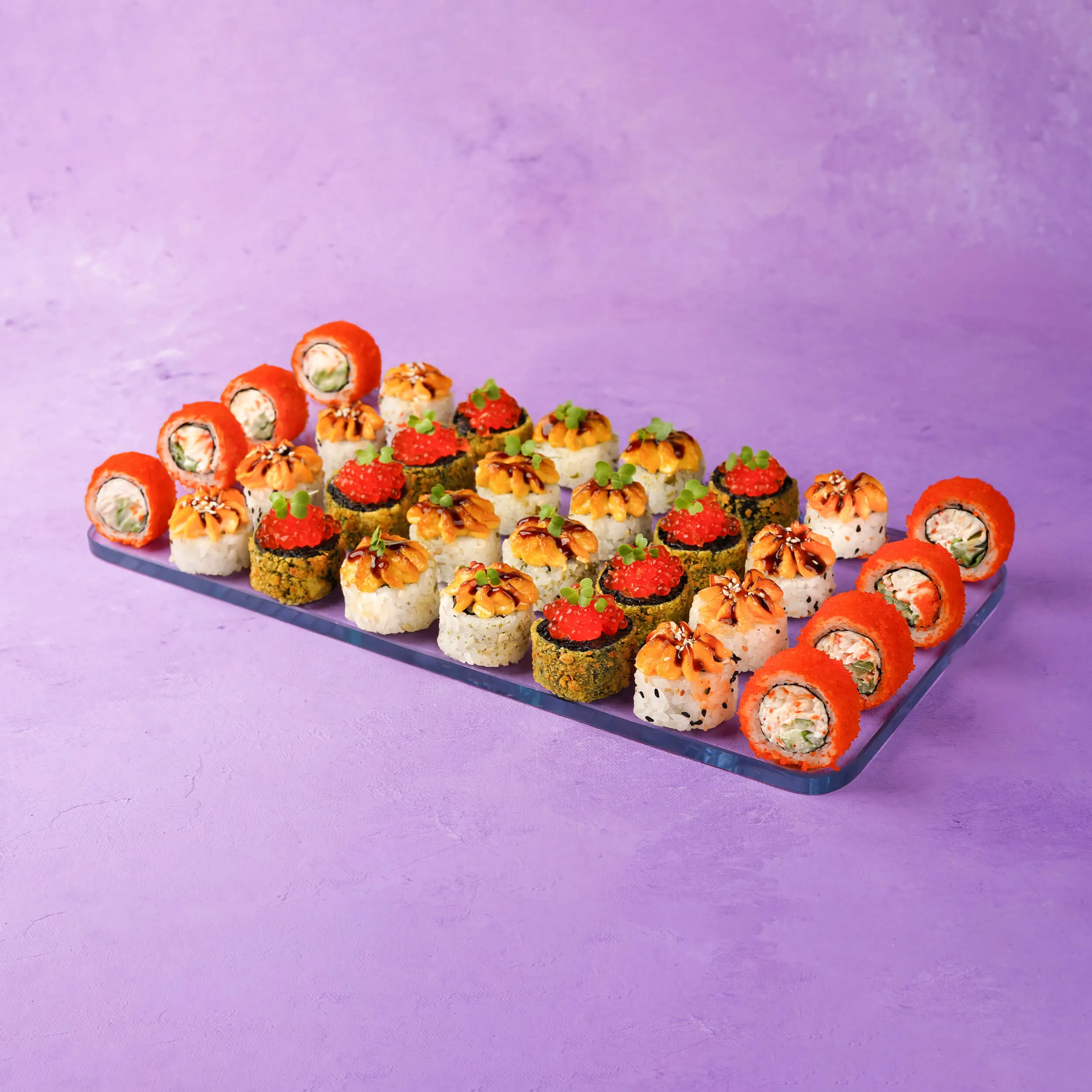 Для голодаев с большими амбициями! В одного или с самим собой - неважно, кайфаните от души! — запеченный ролл «Карнавал», 1 порция; — запеченный ролл «Рок-н-ролл», 1 порция; — темпурный ролл «Сокровище», 1 порция; — холодный ролл «Калифорния с крабом», 1 порция.