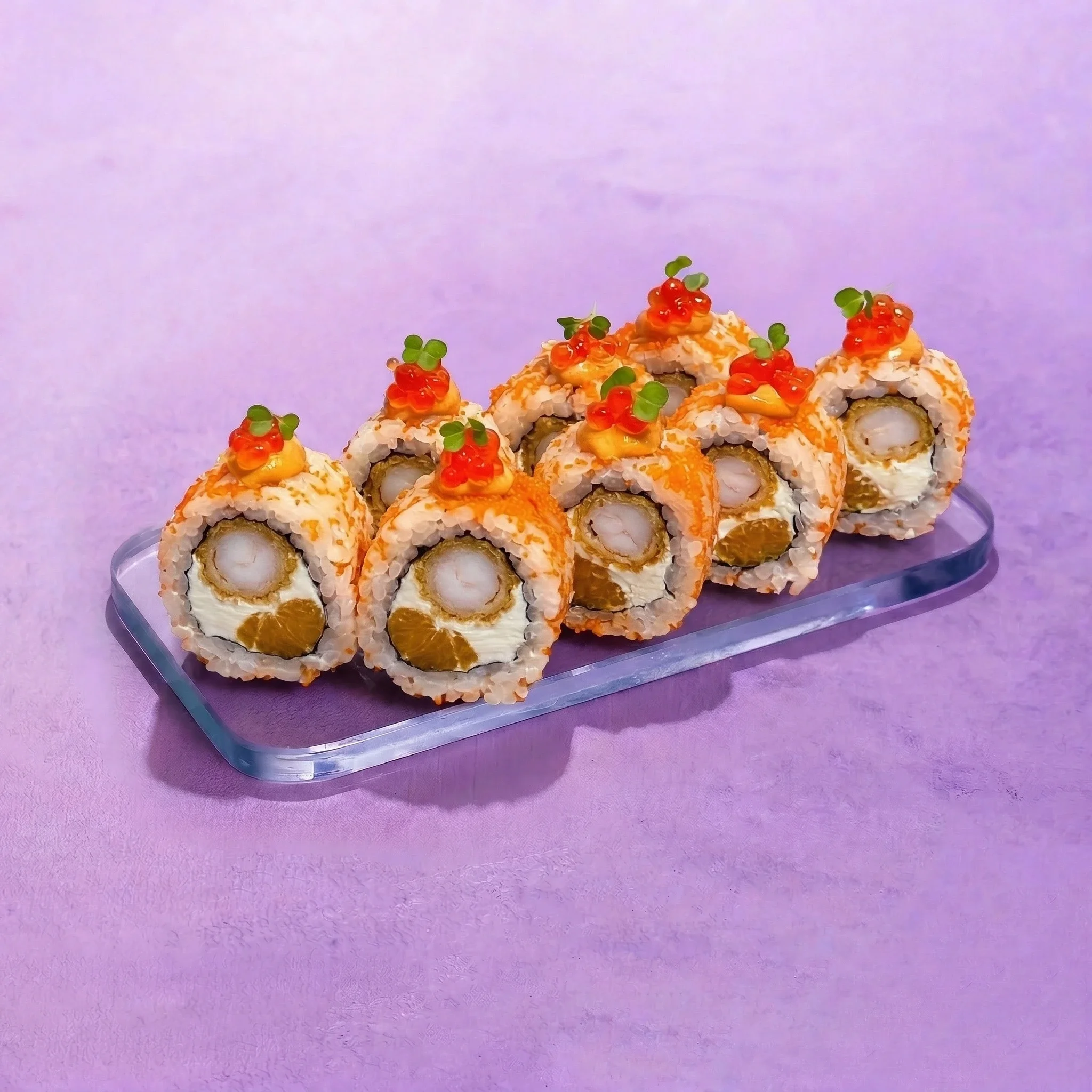 Рис, креветка в темпуре, творожный сыр, мандарин, васаби, имитация икры, икра масаго, том-ям паста, соус майонезный, водоросли нори, микрозелень брокколи.